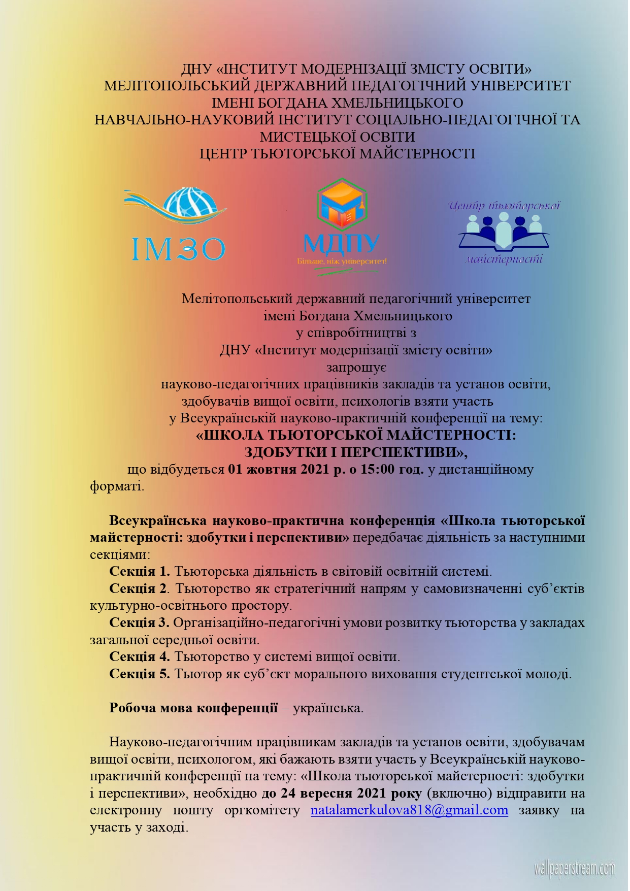 Запрошуємо взяти участь у Всеукраїнській науково-практичній конференції на тему: «ШКОЛА ТЬЮТОРСЬКОЇ МАЙСТЕРНОСТІ: ЗДОБУТКИ І ПЕРСПЕКТИВИ»
