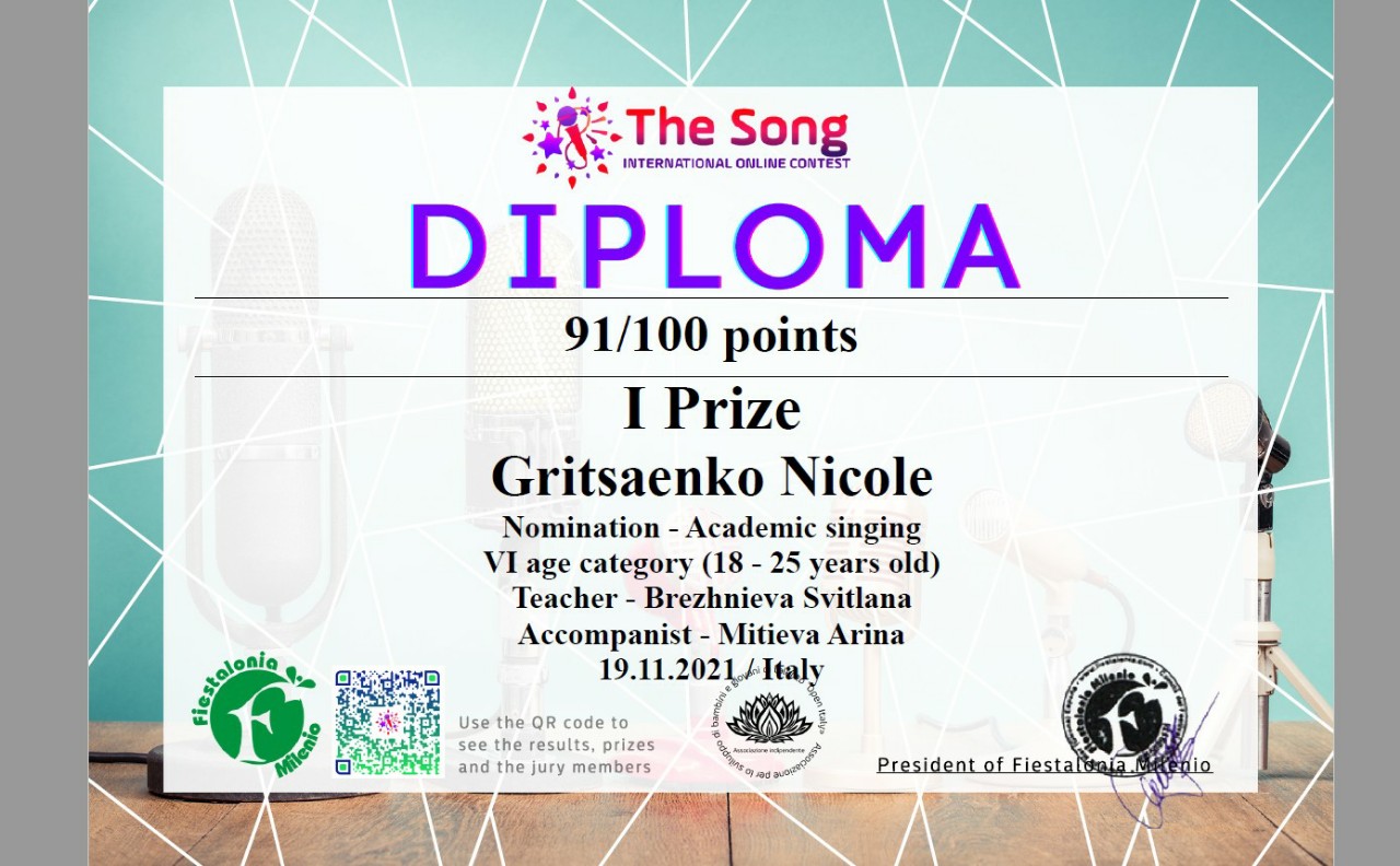 Здобувач вищої освіти Навчально-наукового інституту соціально-педагогічної та мистецької освіти Ніколь Гріцаєнко за результатами голосування журі конкурсу отримала диплом Лауреата І ступеня в номінації «Академічний вокал» (19.11.2021, Італія).
