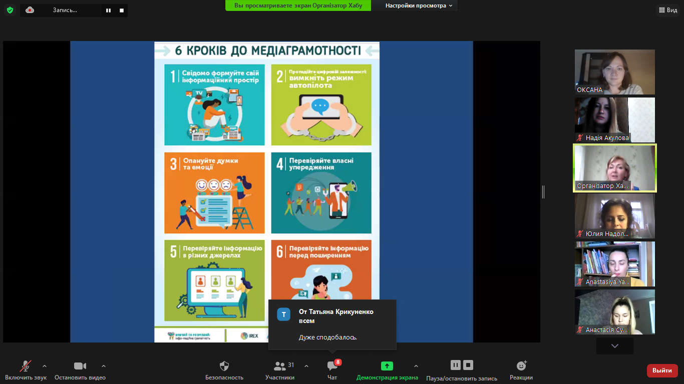 Захід модерувала Тетяна Коноваленко за підтримки всієї команди Хабу інфомедійно-грамотних громадян. Наприкінці зустрічі вона наголосила на важливості бути медіаграмотною особою в умовах сучасного інформаційного буму.