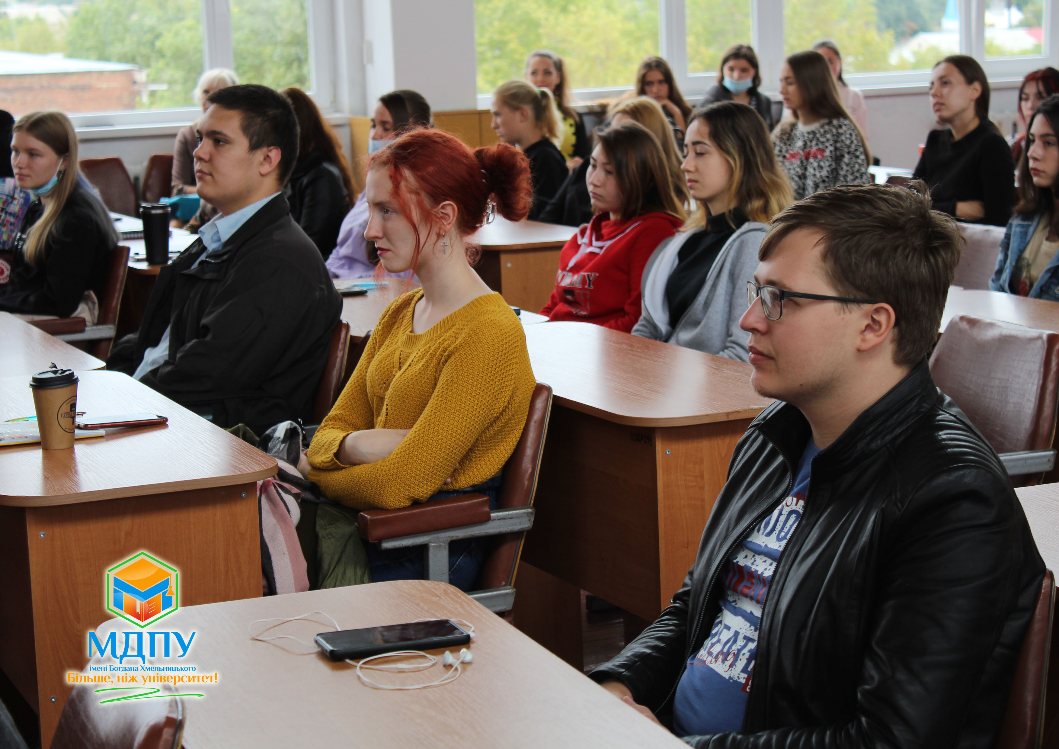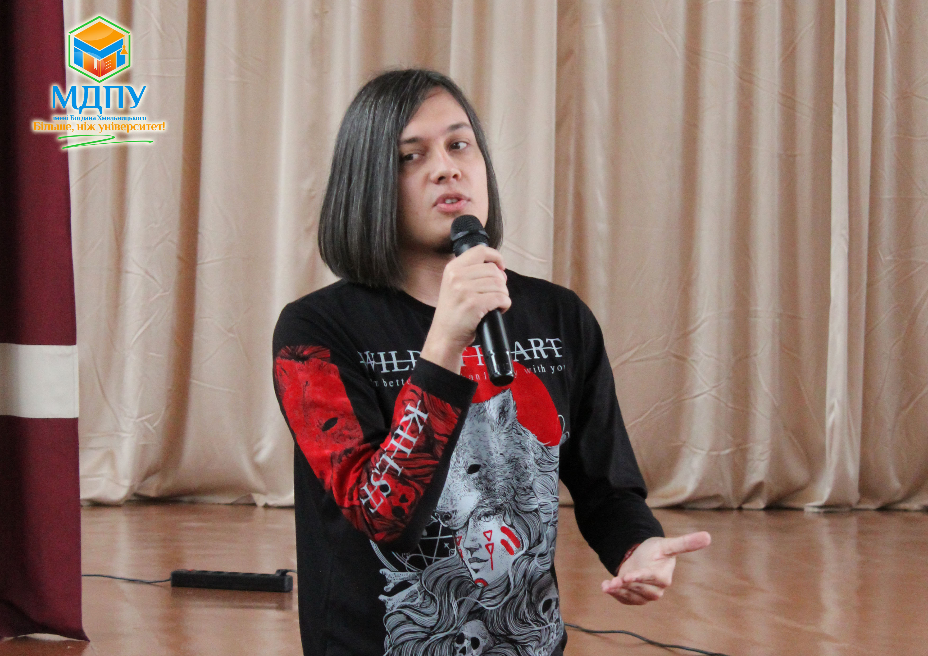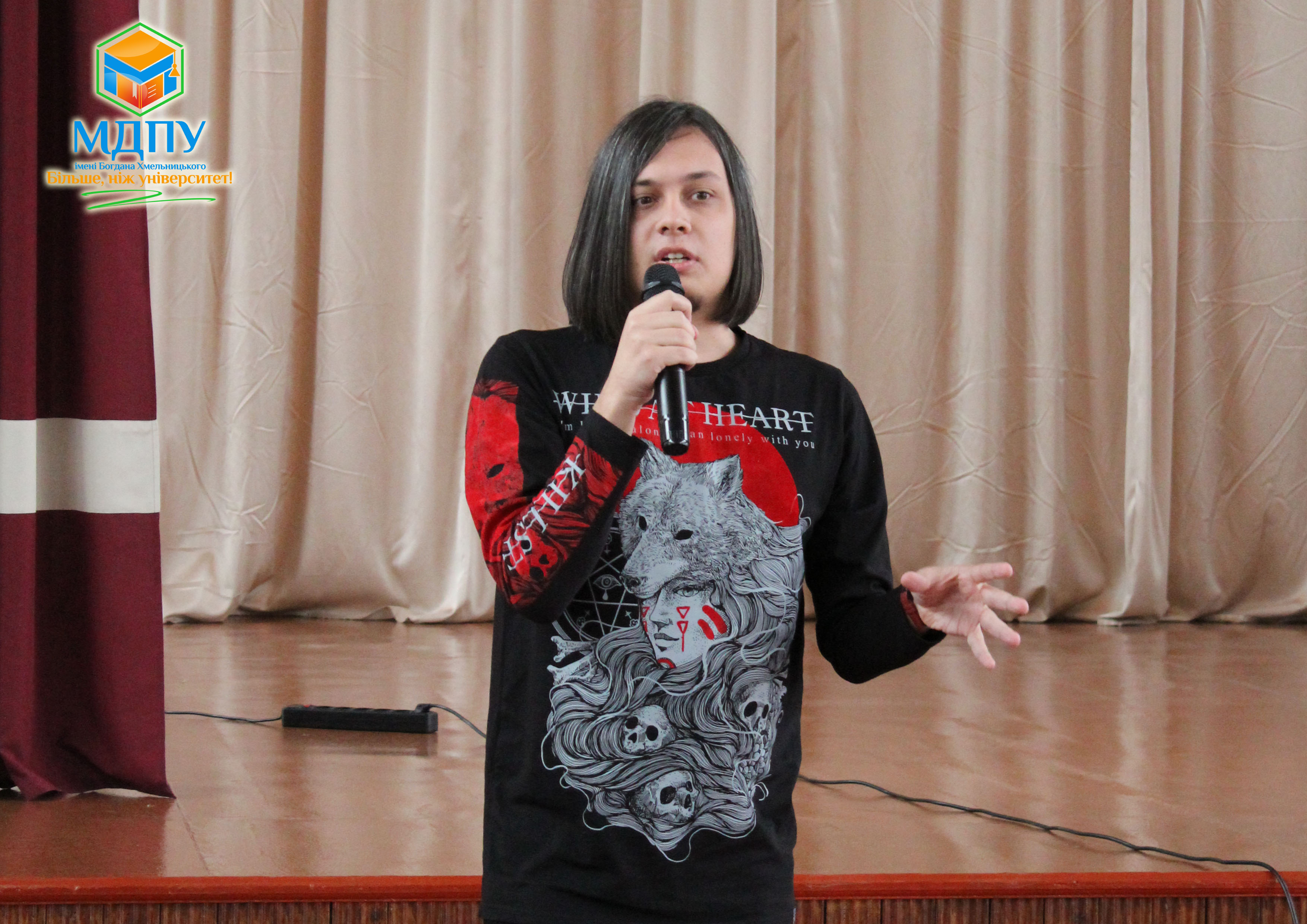 22.09.2021 року в Актовій залі філологічного факультету відбулась зустріч студентів з письменником, перекладачем, музикантом, блогером, одним з засновників Ютуб – каналу «Підпільна Гуманітарка» і випускником філологічного факультету МДПУ імені Богдана Хмельницького Євгеном Ліром.